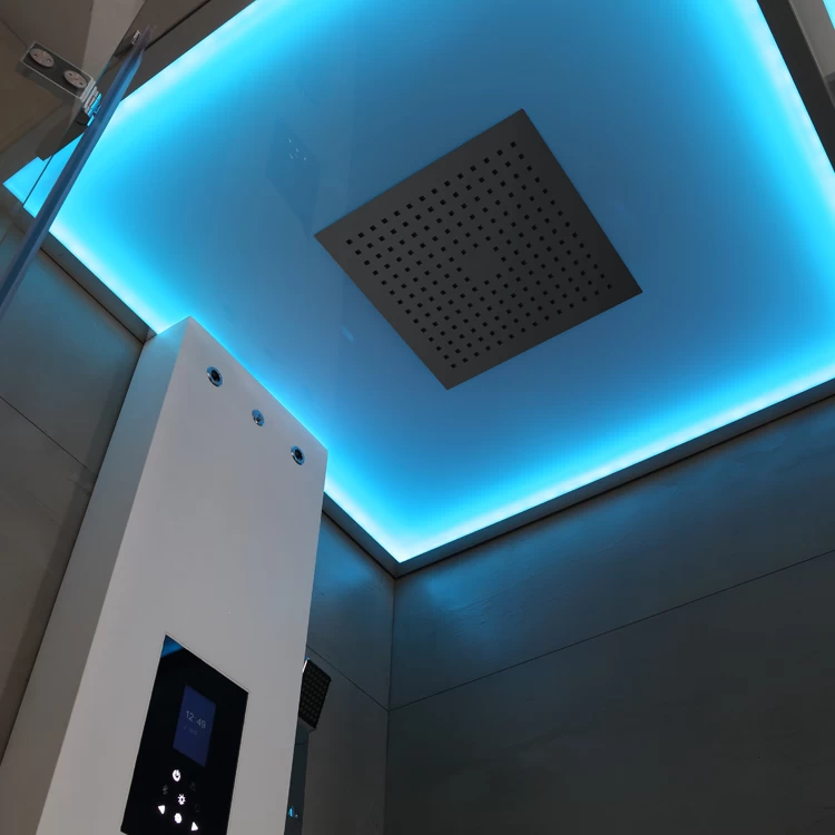Unser neues F15 Bedienfeld ist so aufgebaut, dass es kinderleicht zu bedienen ist. Im Fokus steht natürlich die Dampfsauna-Funktion mit Temperatur und Zeitwahl. Zusätzlich bieten wir aber noch weitere Features, wie eine Ozondesinfektion und eine Reinigungs- und Entkalkungsfunktion. Einzigartig ist an diesem Modell der Himmel mit indirekter Beleuchtung. Das Farblicht wechselt nicht abrupt (wie bei anderen Modellen), sondern bietet sanfte Übergänge.