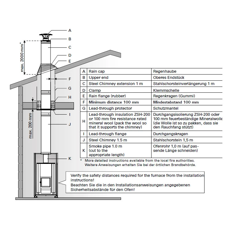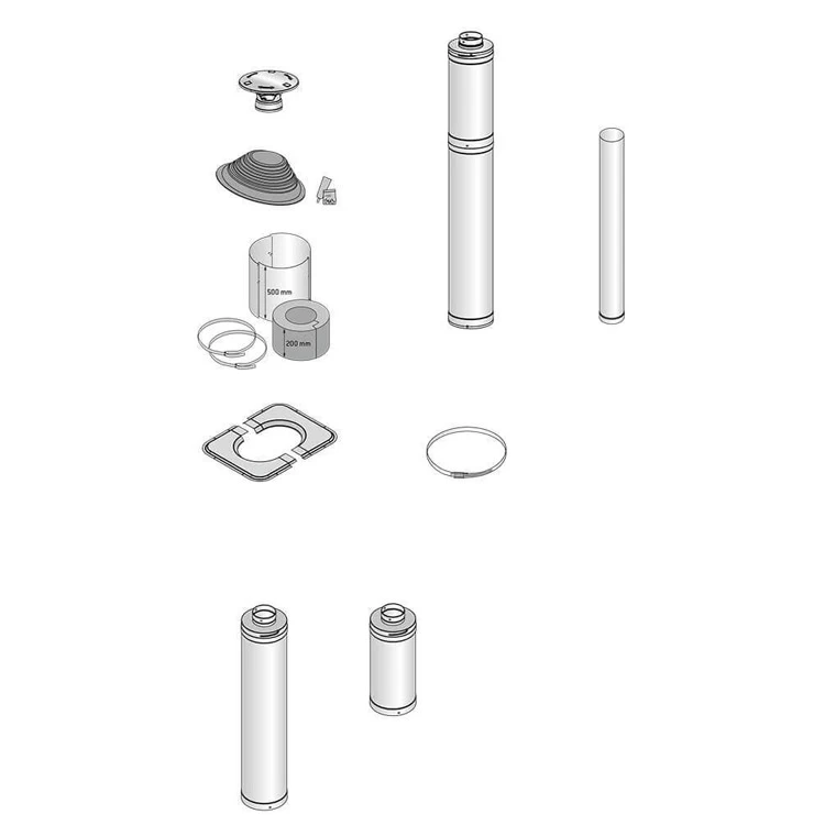- Der Bausatz beinhaltet: 1,5 m isolierter Schornstein, 1,0 m unisoliertes Ofenrohr, Durchgangskragen und Durchgangsisolierung für die Zwischendecke, Regenkragen aus Gummi, Regenhaube, geeignet für Hitzebelastung 600°